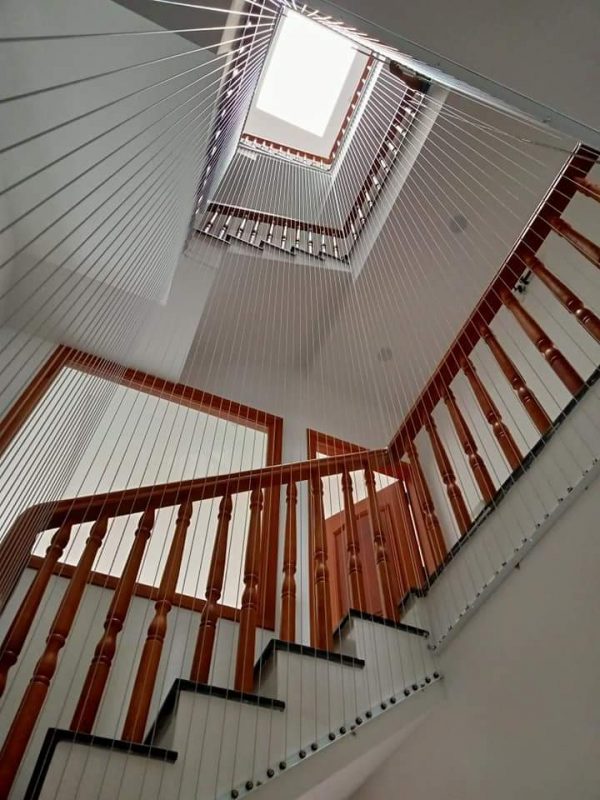 Lưới an toàn cầu thang là những tấm lưới gồm các sợi cáp thép inox bọc nhựa PS được lwps từ thanh vịn cầu thang lên đến trần nhà nhằm đảm bảo an toàn cho người và vật trong quá trình lên xuống cầu thang không bị rơi ra ngoài.